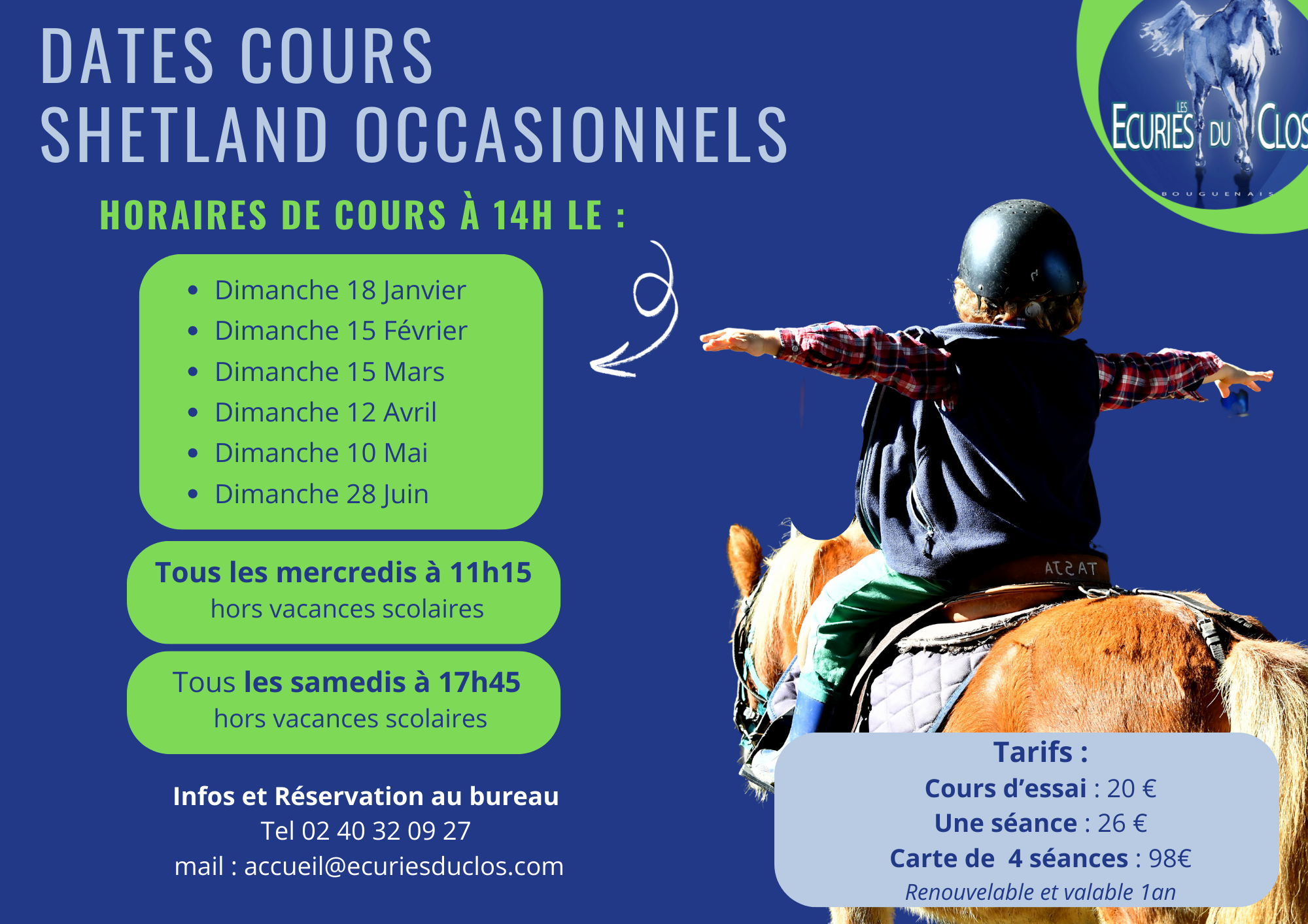 Nous organisons des séances le samedi à 17h45 hors vacances scolaires ou un dimanche par mois à 14h où vous pouvez inscrire votre enfant de manière ponctuelle dans l’objectif de se familiariser avec l’univers du poney et découvrir l’équitation.