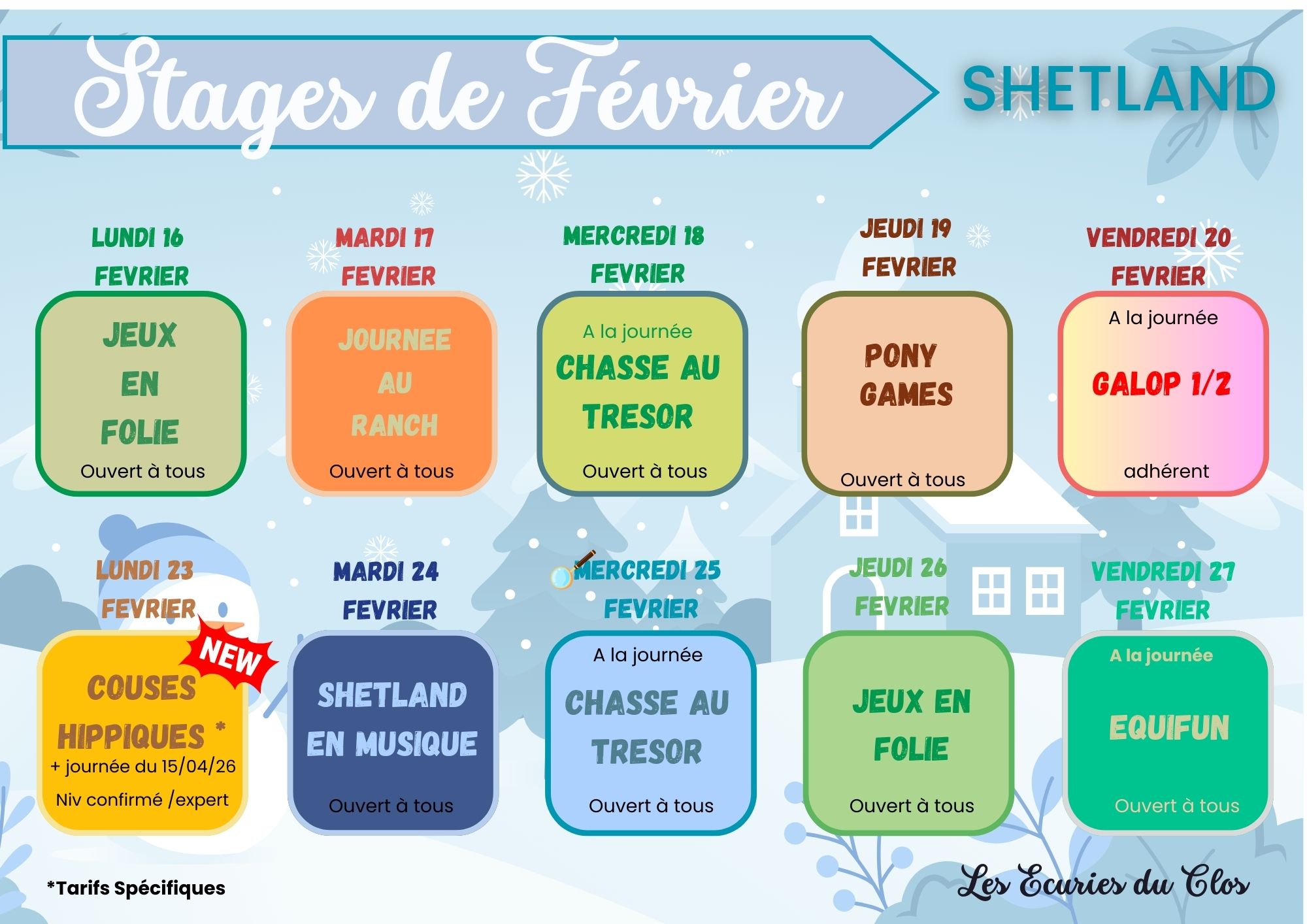 Profitez des vacances scolaires avec nos stages à thème aux Écuries du Clos, disponibles à la journée (9h30-17h) ou à la demi-journée (9h30-12h30/14h-17h).